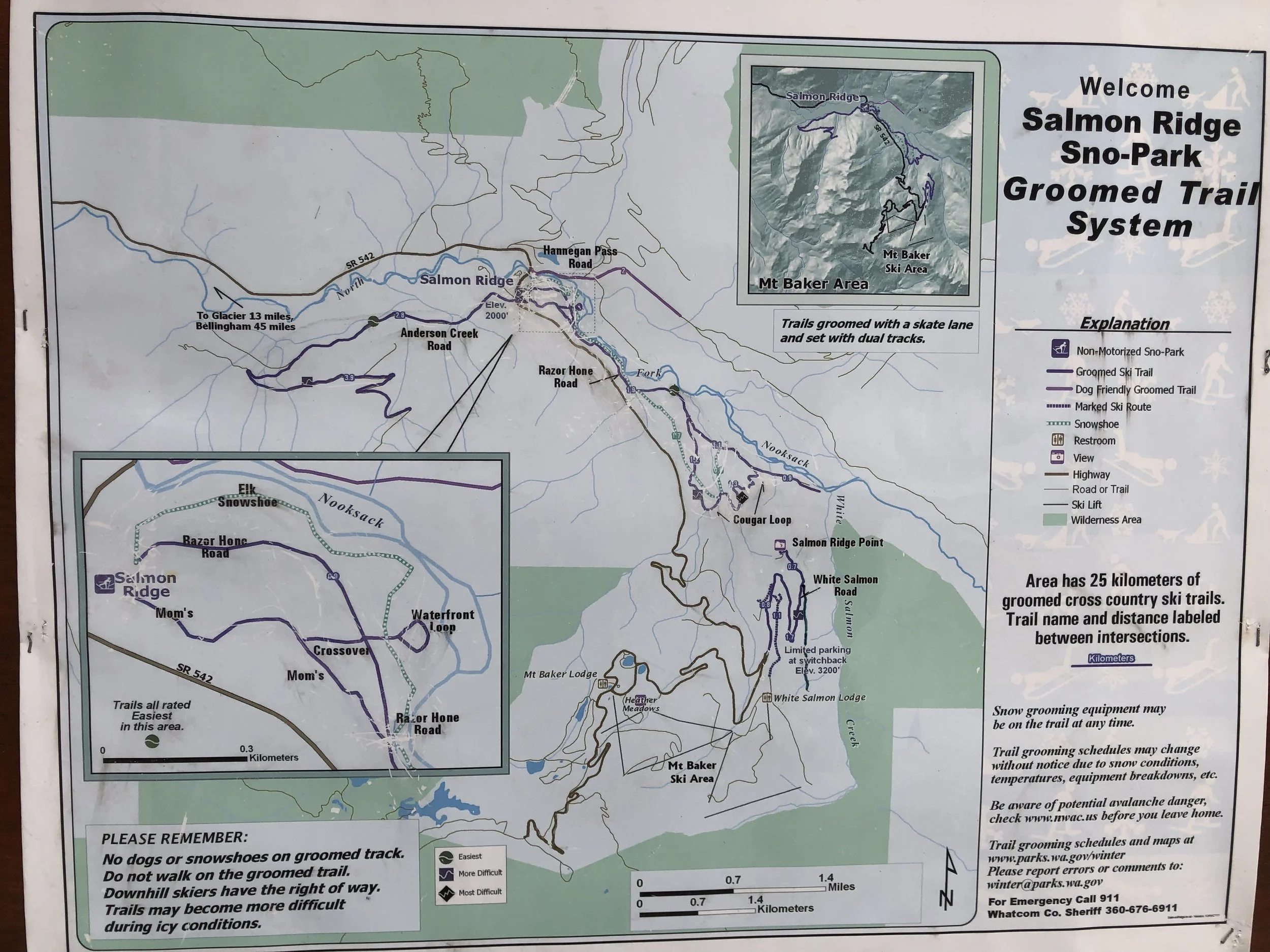 Salmon Ridge Sno-Park ($25 Per Vehicle Permit): A great option for easier snowshoeing (and cross-country skiing) and to still get out into the wilderness at a lower elevation when there is avalanche risk at higher elevations. We explored the Elk Snowshoe trail along the Nooksack River and ventured a bit up Razor Hone Road. It was peaceful and relatively flat. Here are some other hikes from the guidebooks: